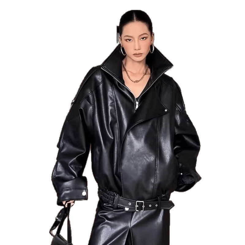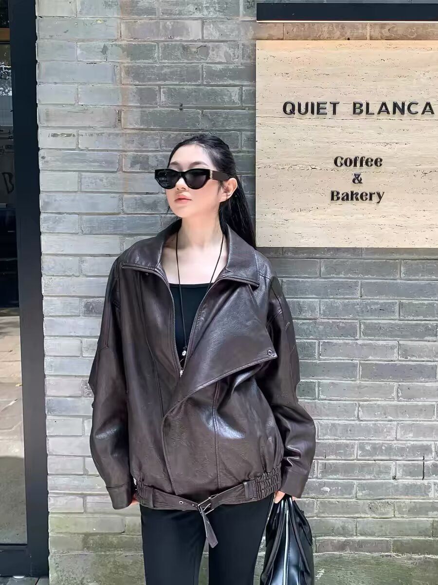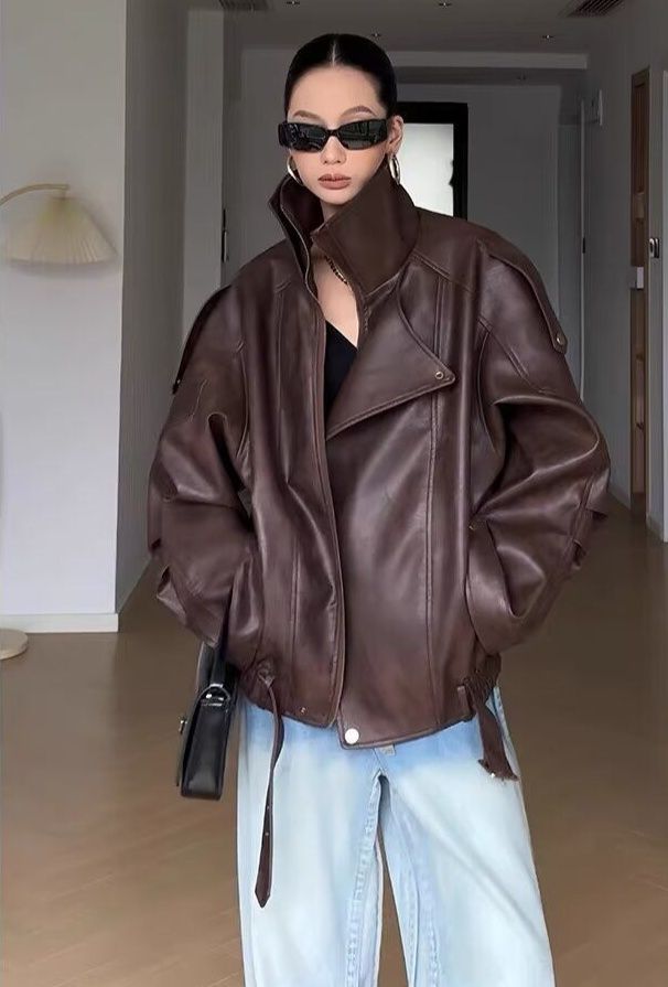 上質な本革を使用したオーバーサイズのレザージャケットです。 ゆったりとした身幅とドロップショルダーが今季らしいリラックス感を演出します。 襟元の大きめラペルとフロントジップがクールな印象を与え、カジュアルからきれいめまで幅広い着こなしに対応します。 袖や裾のスナップボタンがデザインのアクセントになっています。 一枚羽織るだけでこなれた雰囲気が完成する、長く愛用できる定番アイテムです。